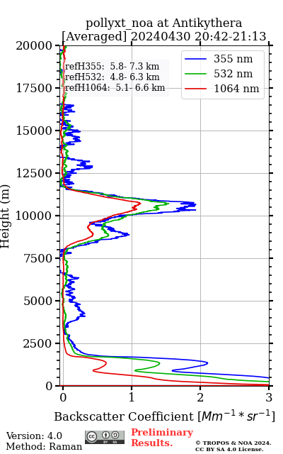 InfoMeteorological data from standard_atmosphere. Reference height is [ 5801.6 - 7340.7m] (355nm), [ 4837.8 - 6332.1m] (532nm) and [ 5106.8 - 6601.0m] (1064nm). Smoothing window is 742.5m, 742.5m, 742.5m. Angstroem exponent is 0.9. If SNR for Raman signal at reference height is low, the Raman method will not be applied.