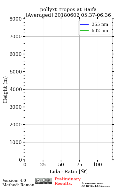 InfoMeteorological data from GDAS1 at haifa on 20180602 06 UTC. Reference height is [ 3492.9 - 4987.2m] (355nm), [ NaN - NaNm] (532nm) and [ NaN - NaNm] (1064nm). Smoothing window is 457.5m, 457.5m, 457.5m. If SNR for Raman signal at reference height is low, the Raman method will not be applied.