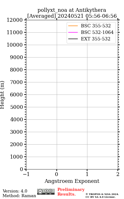 InfoMeteorological data from GDAS1 at antikythera on 20240521 00 UTC. Reference height is [ NaN - NaNm] (355nm), [ NaN - NaNm] (532nm) and [ NaN - NaNm] (1064nm). Smoothing window is 742.5m, 742.5m, 742.5m. If SNR for Raman signal at reference height is low, the Raman method will not be applied.