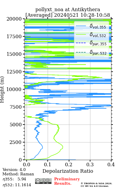 InfoDepolarization factor is 0.0237 at 355nm, 0.0421 at 532nm and at 1064nm. Molecule volume depolarization ratio is NaN at 355nm and NaN at 532nm and NaN at 1064nm.
